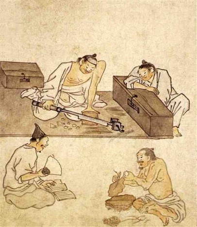 김홍도의 <담배 썰기>담배 잎을 썰고 있는 모습이다.